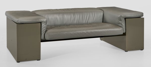 Grau lackiertes Holz und graues Leder. Gerader, querrechteckiger Korpus aus kubischen Seitenelementen. Gerade Sitzfläche sowie lose Polsterelemente. Herstellerzeichen. Entw. Cini Boeri, 1976. H. 52 cm. 179 cm x 89 cm.