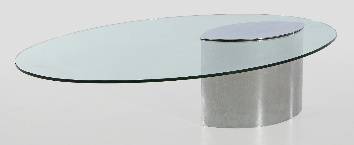 Edelstahl und farbloses Glas. Navettförmiger Korpus als Träger für ovale Deckplatte. Unbez.; Entw. Cini Boeri, um 1970. H. 40 cm. 150 cm x 110 cm.