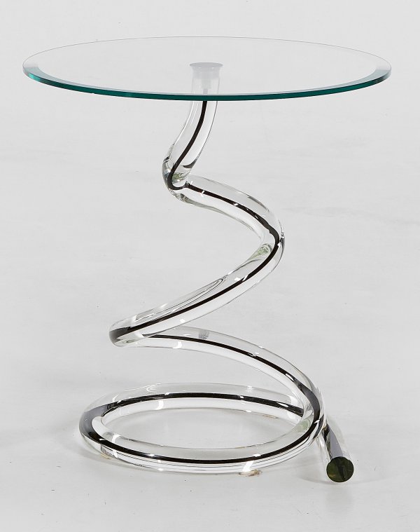 Farbloses Muranoglas und Glas. Gestell aus spiralartig angelegtem Rundstab mit dunkler Ader als Träger für runde, besch. Deckplatte. Unbez. H. 57 cm. D. 55 cm.