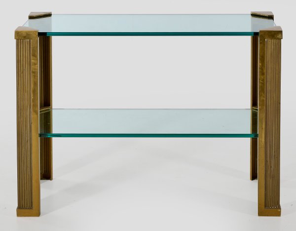 Bronze und farbloses Glas. Offen gestalteter Korpus aus gekanteten, godronierten Streben als Träger für rechteckige Deckplatte und entsprechendes Ablagefach. Herstellerzeichen. Entw. Peter Ghyczy, 1970er Jahre. H. 72 cm. 100 cm x 40 cm.