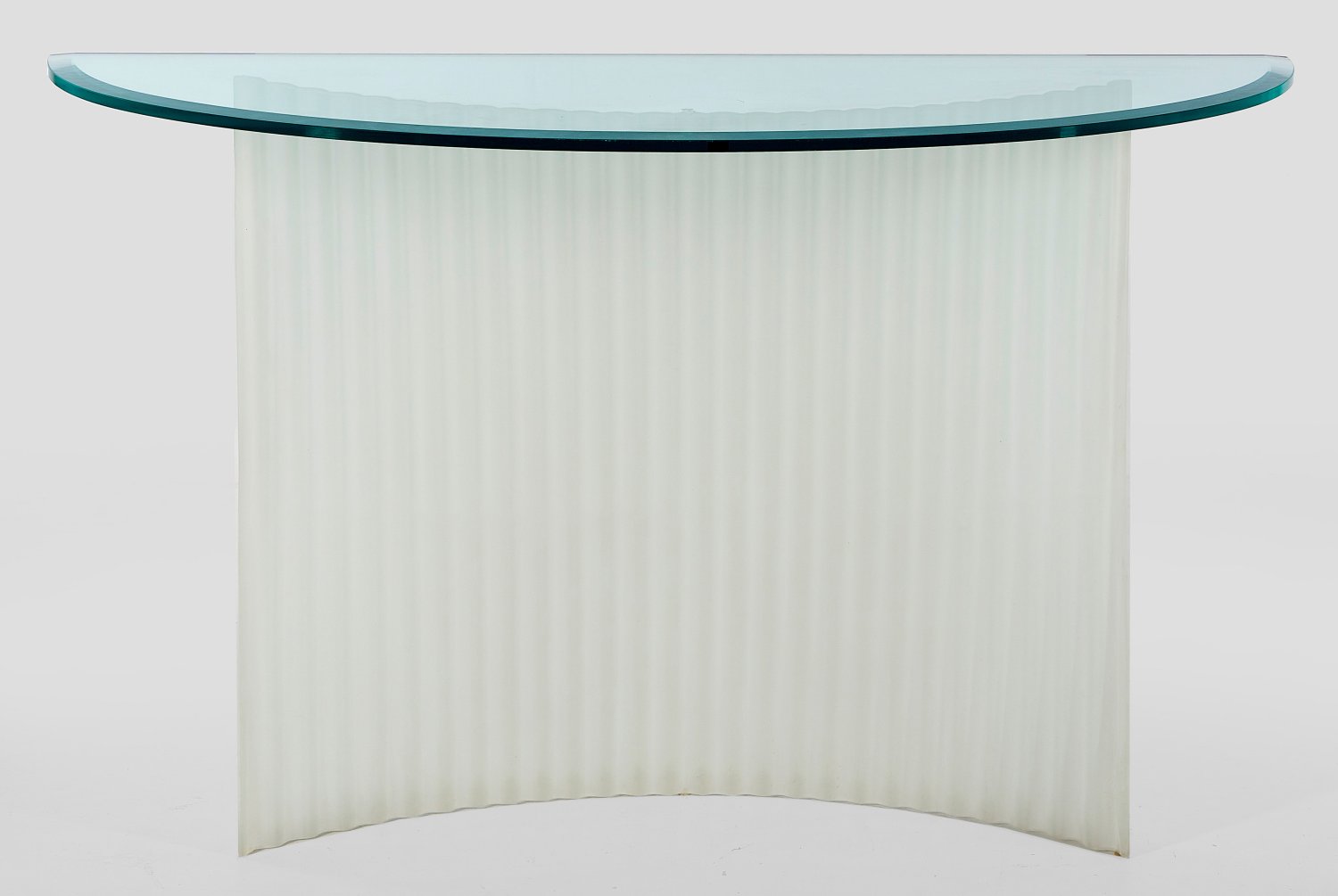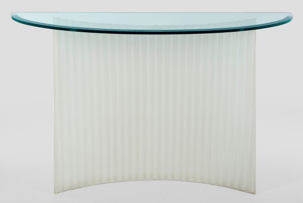 Farbloses, teilw. satiniertes Glas. Wellenartig angelegter Korpus mit flächendeckendem Rippendekor als Träger für gerundete facettierte Deckplatte. H. 81 cm. 135 cm x 47 cm.