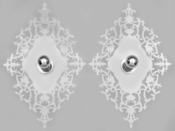 als Wand- bzw. Deckenleuchte nutzbar. 1-flg.; Farbloses Acrylglas. Kartuschenförmiges, durchbrochen gearbeitetes Wand- bzw. Deckenschild aus üppigen Volutenmotiven im barocken Stil. Herstellerzeichen. Elektrifiziert. Entw. Blandine Dubos und Richard Fard. 58 cm x 38 cm.