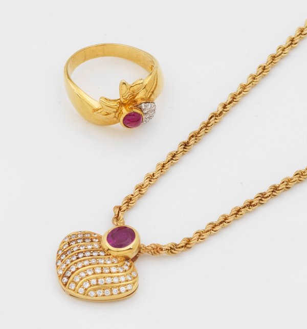 Ring und Collier. Gelbgold, gest. 750. Besetzt mit pinken Rubinen von zus. ca. 1,02 ct. und Diamanten von zus. ca. 0,12 ct. (vvsi/w) und 0,46 ct. (vsi/w). Ges.-Gew. ca. 21,52 g.