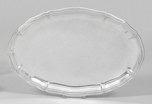 Sterlingsilber. Ovale Form. Glatter, gering gemuldeter Spiegel, übergehend in blütenförmig geschweiften, mehrfach profilierten Rand. Gest. 925, Herstellerzeichen. Gew. ca. 385 g. 32 cm x 22 cm.