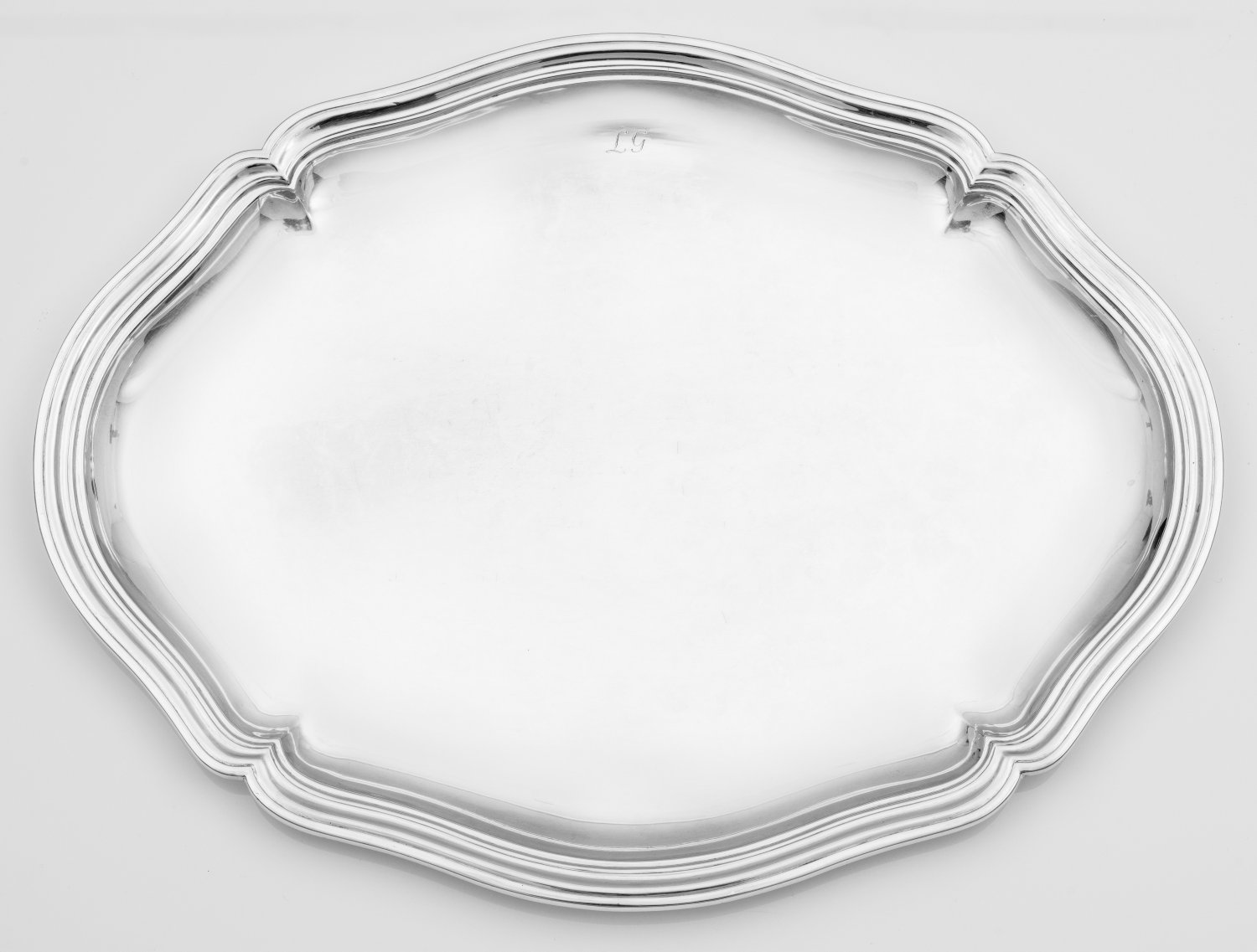 Silber. Ovale Form. Glatter, gering gemuldeter Spiegel, übergehend in blütenförmig geschweiften, mehrfach profilierten Rand. In gerundeter Fahne graviertes Monogramm "L G". Gest. 800, Herstellerzeichen. Gew. ca. 1150 g. 49 cm x 37,5 cm.