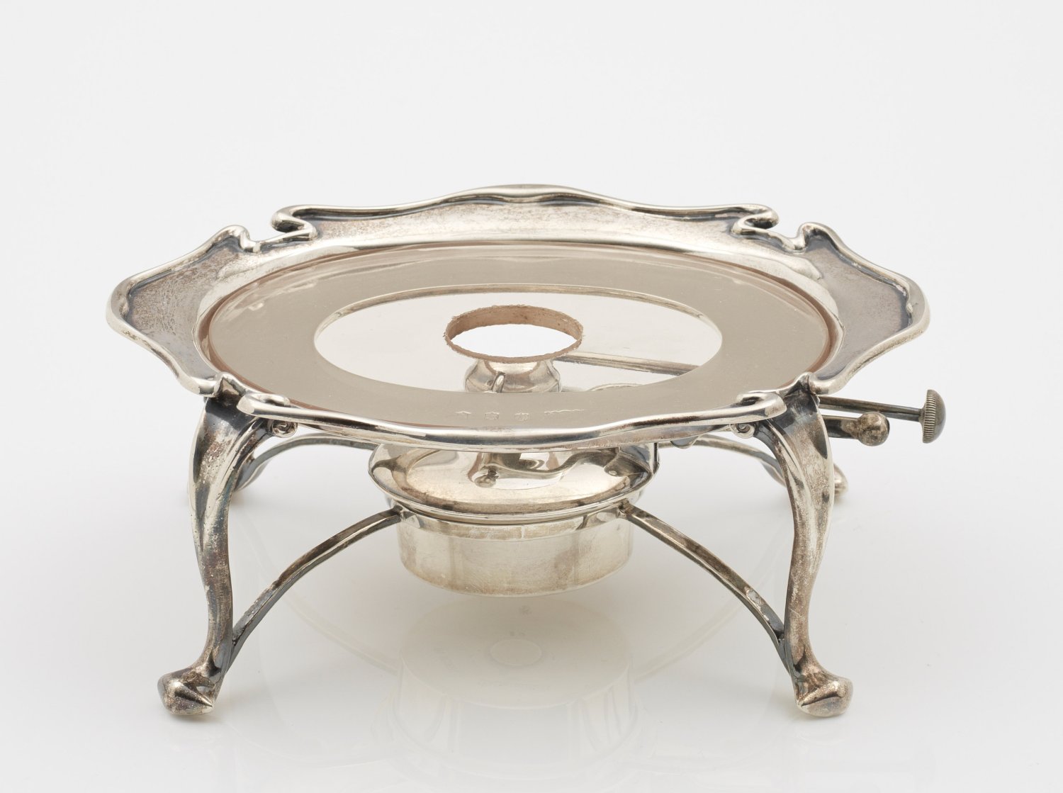 Sterlingsilber. Über vier ausgestellten Beinen die ovale, am Rand passig geschweifte, mittig oval durchbrochene Standfläche mit erg., passiger Glasscheibe. Darunter herausnehmbarer Brenner einsetzbar in Gestell aus filigranen Streben. Gest., Beschaumarken, Herstellerzeichen, Jahresbuchstabe "Q". Gew. ca. 465 g. H. 7,5 cm. 19 cm x 15 cm.
