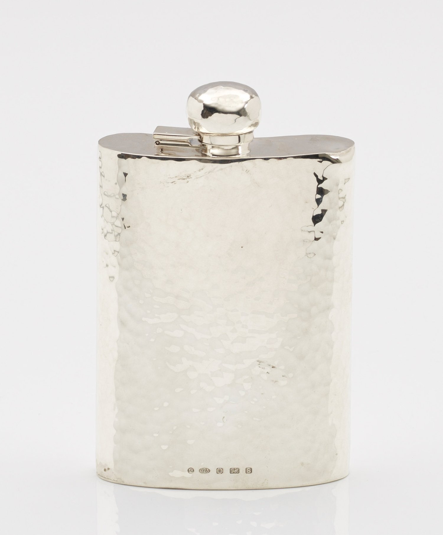 An elegant English Sterling silver hip-flask with hammered pattern. Assay and maker's mark, date letter "S". Minor dented.