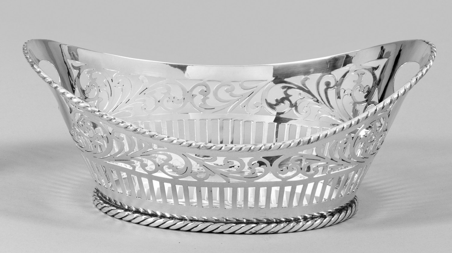 Sterlingsilber. Über flachem, ovalem Stand sich konisch erweiternder, schiffchenförmiger Korb. Die Wandung umlaufend durchbrochen gearbeitet in Form von Stäben und Blattranken. Seitliche Griffmulden. Gest. 925, Herstellerzeichen. Gew. ca. 390 g. H. 8 cm. 22,5 cm x 15,5 cm.