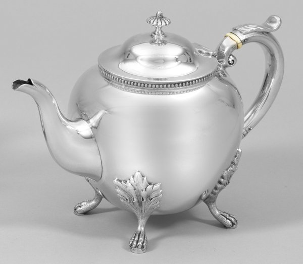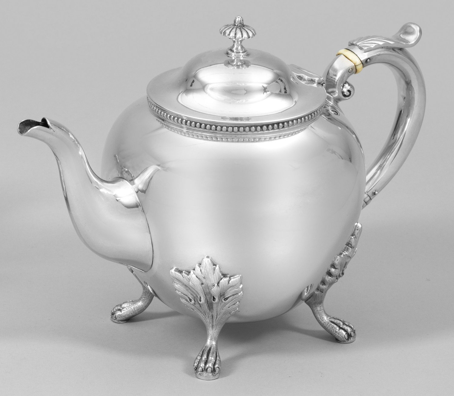 Silber. Vier vollplastische Tatzenfüße, am Ansatz mit reliefplastischem Akanthusblatt verziert, übergehend in gering ovoiden, bauchigen, glatten Korpus mit konischem Röhrenausguss und volutiertem Ohrenhenkel. Der Rand mit zartem Perlband umzogen. Aufgewölbter Scharnierdeckel mit godroniertem, blütenförmigem Knauf. Schauseitig auf der Wandung ein ligiert monogr. und dat."1865". Gest., Herstellerzeichen. Gew. ca. 880 g. H. 18 cm.