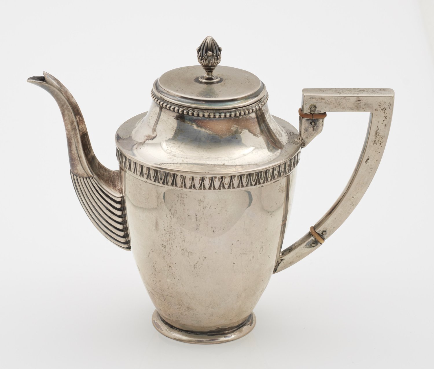 Silber. Sich konisch erweiternder Korpus mit gekanteter Schulter, umzogen von Blattfries. Mittig angesetzter, godronierter Röhrenausguss sowie gekanteter Henkel. Flacher Scharnierdeckel mit Perlband verziert und bekrönt von Pinienzapfenknauf. Rest.; Gest. 800. Herstellerzeichen. Modell-Nr. 10123. Gew. ca. 405 g. H. 19,5 cm.