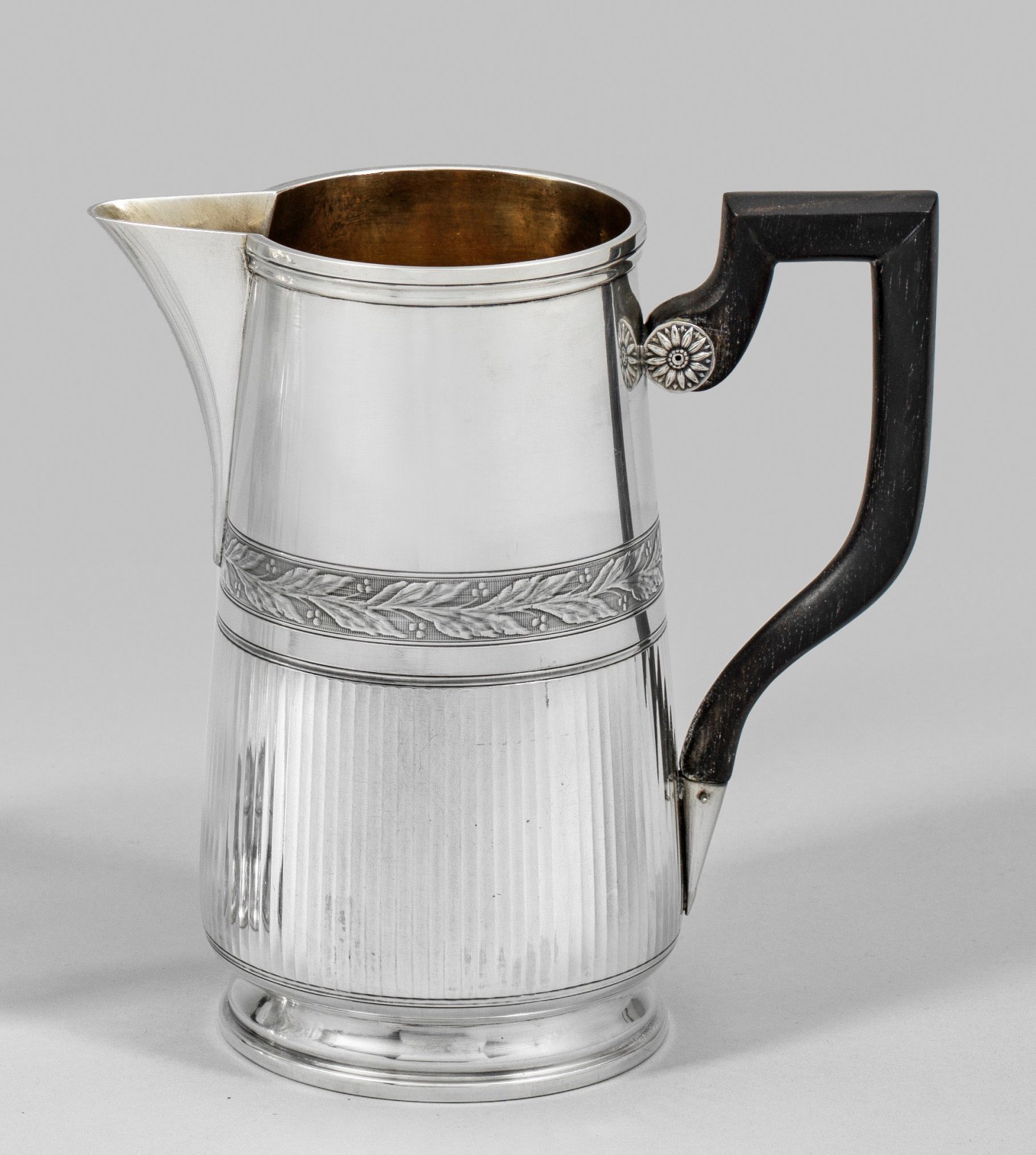 Silber. Über rundem, profiliertem und gekehltem Stand sich konisch verjüngender Korpus mit hoch angesetztem, kurzem Ausguss und gering ausgestelltem Lippenrand. Gekanteter, ebonisierter Holzhenkel, am Ansatz von Blütenblattrosette gefasst. Glatte Wandung, in der unteren Hälfte umzogen von feinen, flachen Kanneluren. Mittig umlaufendes Zierband mit stilisierter Lorbeerblattranke. Innen vergoldet. Gest., französische Exportmarke seit 1879, Herstellerzeichen. Gew. ca. 335 g. H. 16,5 cm.