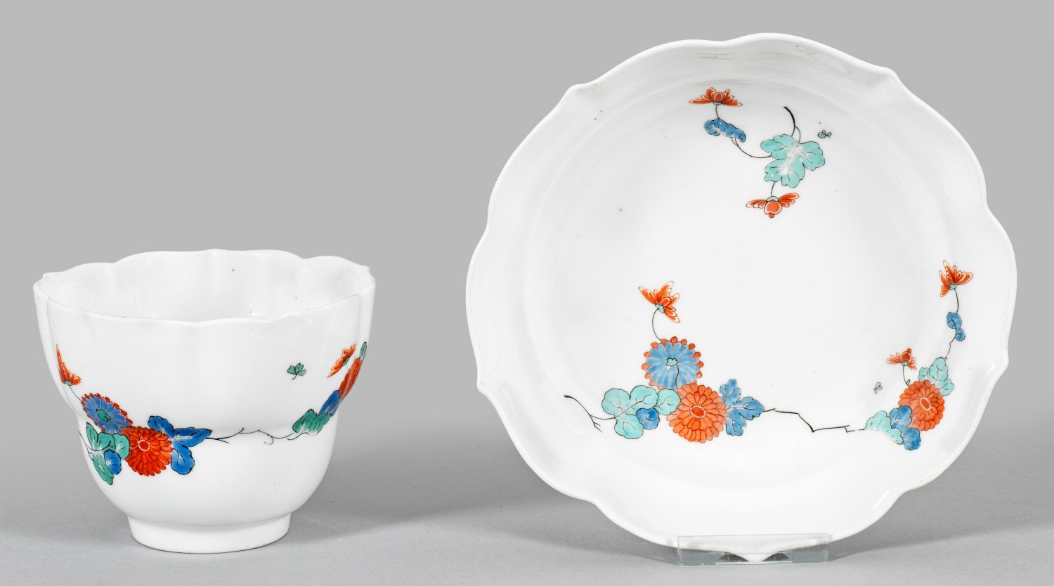 auf Unterschale. Bauchige, mehrfach passig geschweifte Form mit mittig eingeschnürter Wandung. Auf der Wandung und im Spiegel Chrysanthemenzweige im japanischen Kakiemonstil. Polychrome Malerei in Eisenrot, Seegrün und Emailblau mit Schwarzkonturierung. Eingeritzte Johanneums-(bzw. Palais-) Nr. "N=336.w" (Inv.-Nr. des Japanischen Palais). Teilw. minim. rest.; Schwertermarke. H. Tassen-H. 7 cm. D. 9,5 cm - 14, 5 cm.