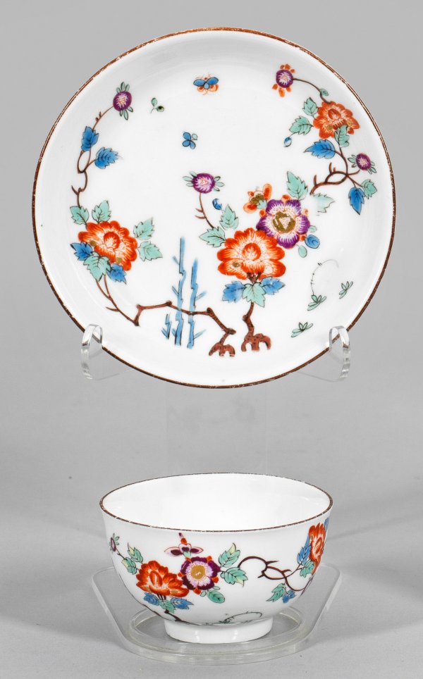 auf Untertasse. Halbkugelige Form. Auf der Wandung und im Spiegel aufsteigende, blühende Päonienstauden. Polychrome Kakiemonmalerei nach japanischem Stil in Emailblau, Eisenrot, Purpur, Seegrün und wenig Gelb, teilw. goldgehöht. Dreherzeichen für Johann Gottlieb Kühnel Sen. (tätig seit 1732). Schwertermarke. H. 4,5 cm.