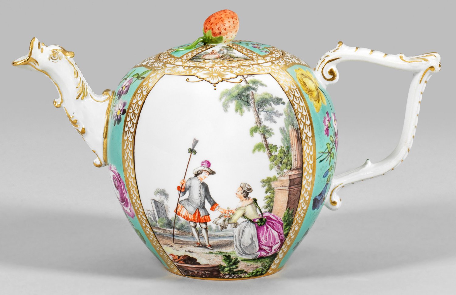 Kugelförmiger Korpus, seitlich geschweifter J-Henkel mit Palmette und gebogter Röhrenausguß in Gestalt eines Tierkopfes. Eingelassener Deckel, mittig plastischer Erdbeerknauf. Beidseitig der Wandung und auf dem Deckel, in goldornamentierten Reserven, szenische Darstellung von Schäferpaaren nach Watteau-Art im Wechsel mit farbenprächtigem, in Türkisfond ausgespartem "Deutsche Blume"-Dekor. Polychrome Malerei mit Goldstaffage. Im Boden Zahl "44" in Purpur. Minim. rest.; Schwertermarke. H. 12 cm.