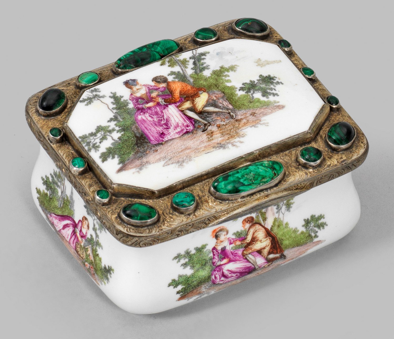 Rechteckiger, unterhalb gebauchter Korpus. Allseitig unterschiedliche, szenische Darstellungen höfisch gekleideter Watteaufiguren in baumbestandener Parklandschaft. Der Innendeckel mit erotischer Szene in Tüpfelmanier. Feine, polychrome Malerei. Polierte Innenwandvergoldung. Floral gravierter, metallmontierter Scharnierdeckel mit achteckig gerahmter Porzellanplatte sowie umlaufend gefassten Malachitcabochons. Minim. best.; H. 4 cm. 7,5 cm x 6 cm.