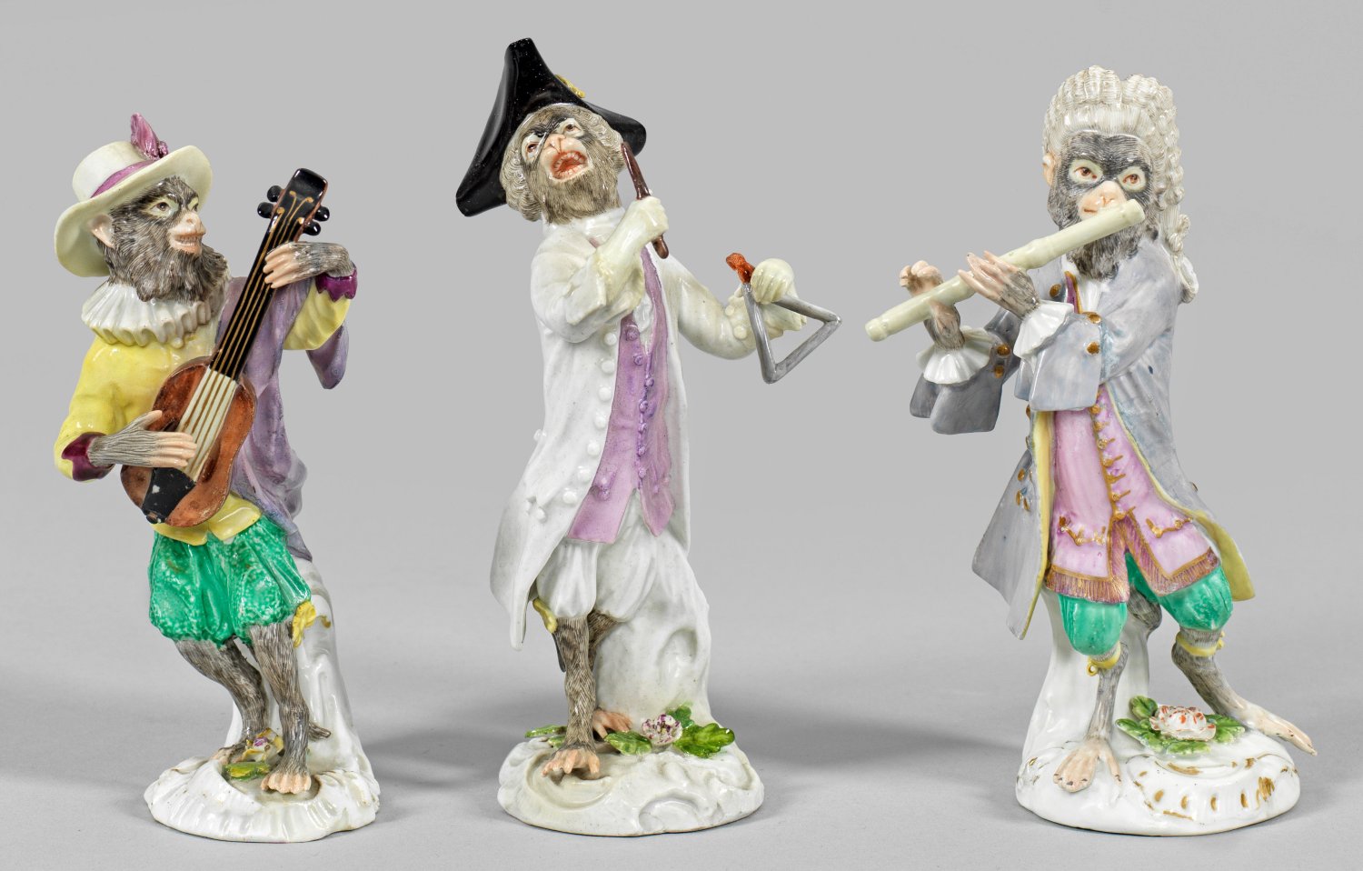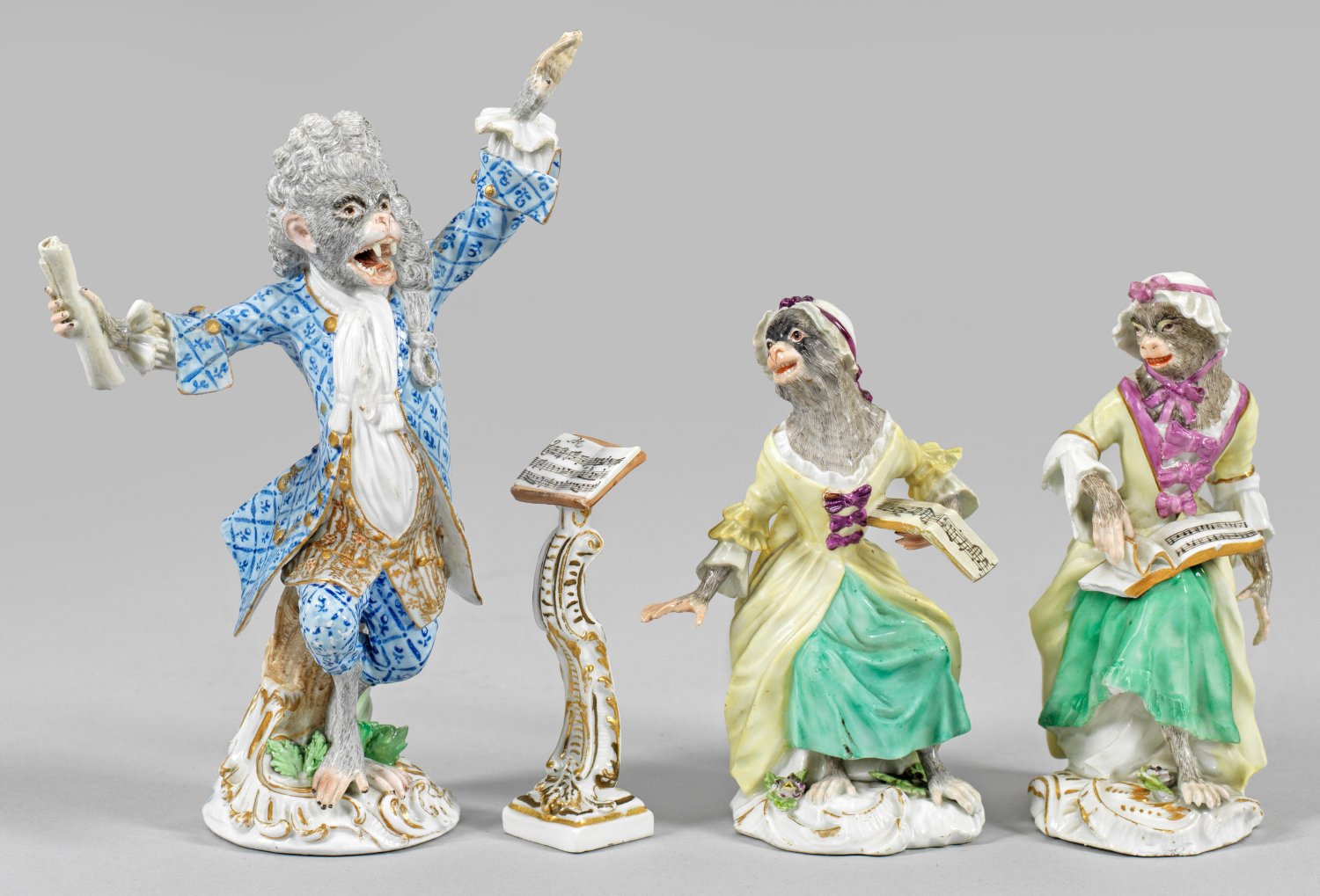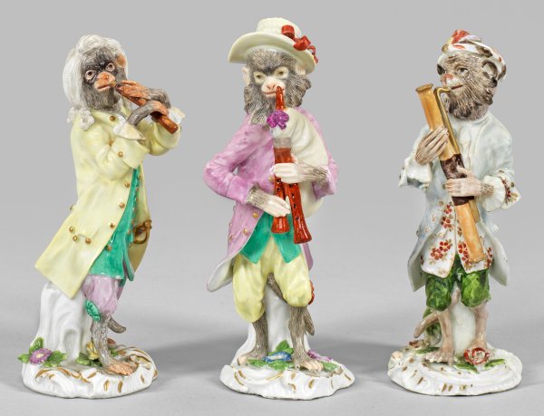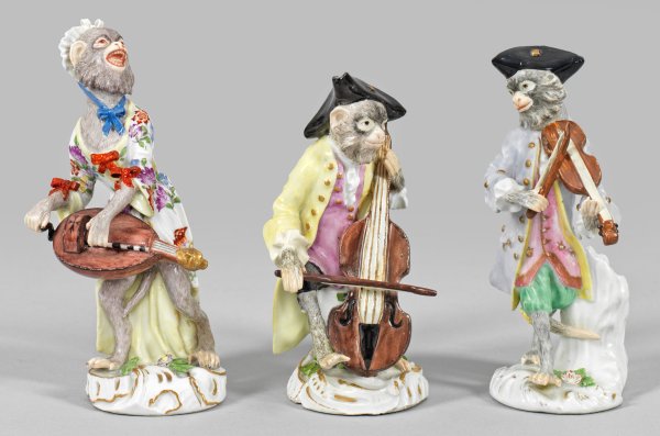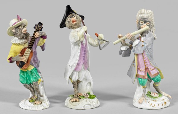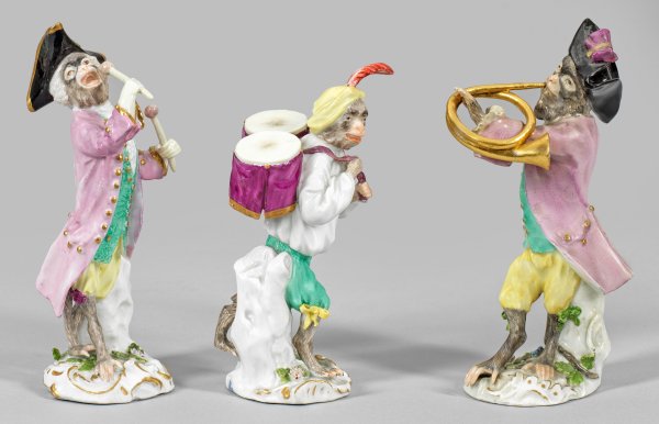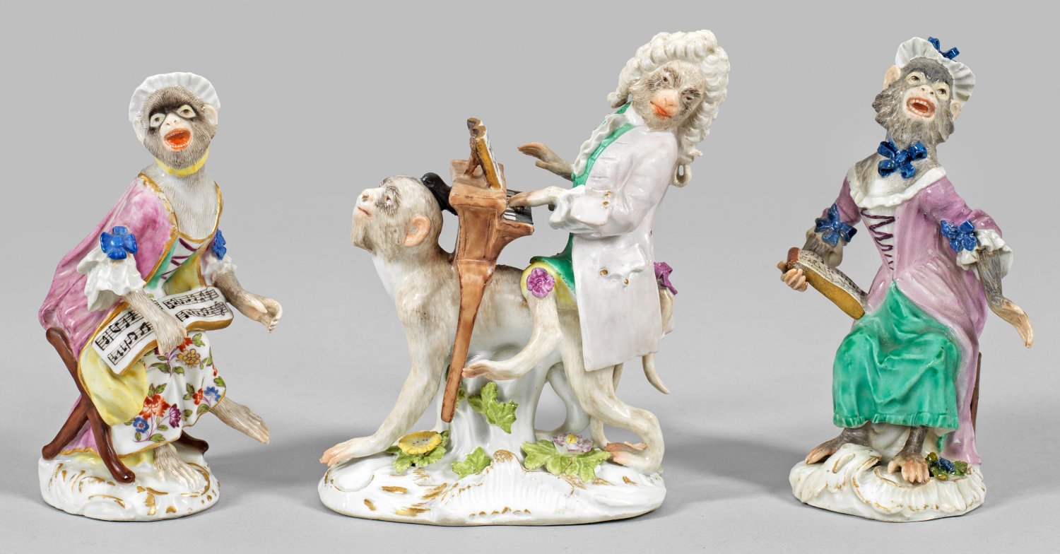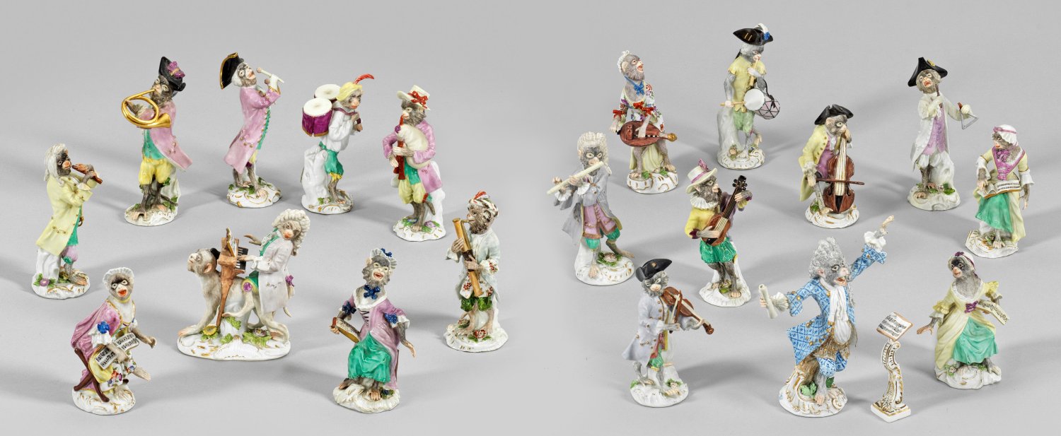 Äußerst seltene, umfangreiche Sammlung der Affenkapelle aus dem 18. Jh.; Die unterschiedlichen Affen der Kapelle werden in den Arbeitsberichten Johann Joachim Kaendlers in der Zeit von 1749 und 1766 erwähnt. Bereits 1753 gestaltete Kaendler ein Ensemble musizierender Affenfiguren in farbenfroher Kleidung mit affektiert wirkendem Ausdruck, die er in Zusammenarbeit mit Peter Reinicke um 1765/1766 nochmals überarbeitete. Darstellungen von Tieren mit menschlichen Eigenschaften und Verhaltensweisen erfreuten sich, nicht zuletzt wegen des großen Interesses an Fabeldichtungen im 18. Jh., höchster Beliebtheit, vor allem in den sog. "Singerien" französischer Künstler, die kuriose, szenische Darstellungen von menschlich agierenden Affen in verschiedenen Situationen zeigten. Vereinzelte Meissener Figuren der Affenkapelle des 18. Jhs. sind in nationalen und internationalen Museen vertreten, u.a. in den Staatl. Kunstsammlungen Dresden, Eremitage St. Petersburg und im British Museum London.