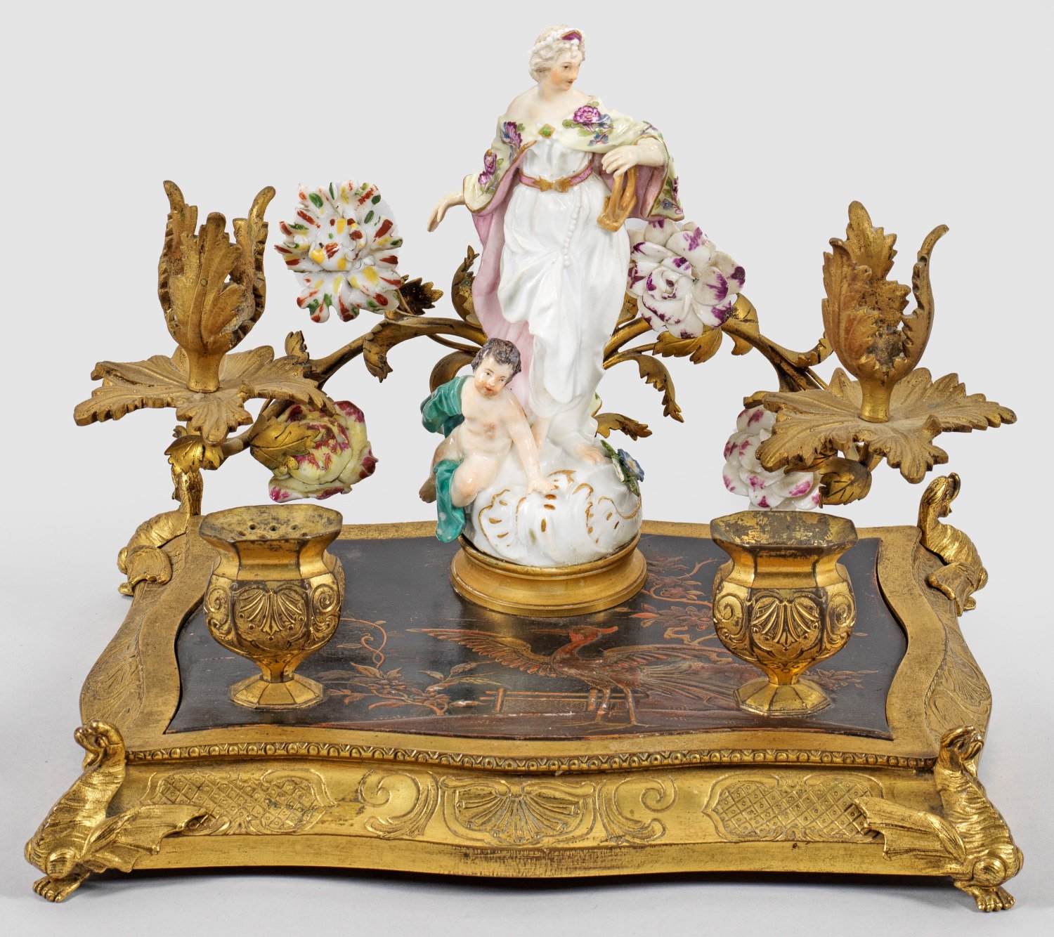 Bronze. Holz. Rechteckiger, geschweifter, rocailleverzierter Sockel mit plastischen Drachenfüßen. Eingefasste Holzplatte mit Kranichmotiv in japanischer Lackmalerei. Darauf vasenförmiges Streusand- und Tintengefäß sowie zentrale Meissener Figurengruppe, "Allegorie der Musik" als antikisierende, junge Frau in weißem Gewand und zartgelben, von Indianischen Blumen gemustertem Umhang. Zu ihren Füßen sitzender Putto. Entw. J. J. Kaendler. Rückseitig, sich verzweigende Ranken als Leuchterarme mit großen Porzellanblüten, in blattförmige Tüllen übergehend. Figur unw. rest.; Schwertermarke. Figuren-H. 15,5 cm. Ges.- H. 19 cm. 26 cm x 20 cm.