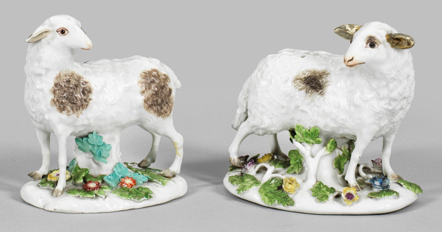 Auf ovalem, von plastischen Blüten und Blättern belegtem Sockel stehendes Schaf, nach rechts bzw. links gewandt. Naturalistisches, gelockt reliefiertes, teilw. bräunlich geflecktes Fell. Polychrome Malerei. Entw. Peter Reinicke, 1747. Rest., Best.; Schwertermarke. H. 10,5 cm. L. 9,5 cm - 11 cm.
