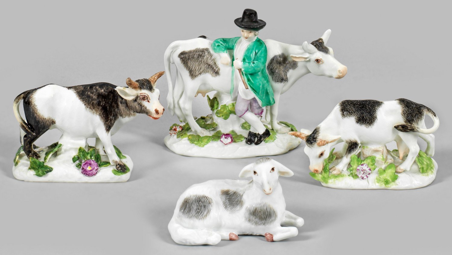 Zwei grasende Kühe, liegendes Schaf sowie Bauer mit Kuh. Naturalistische Darstellung, teilw. auf flachen, mit plastischen Blüten und Blättern belegten Sockeln. Entw. J. J. Kaendler und J. G. Ehder. Polychrome Malerei. Rest.; H. 4 cm - 7,5 cm. L. 6 cm - 9 cm.