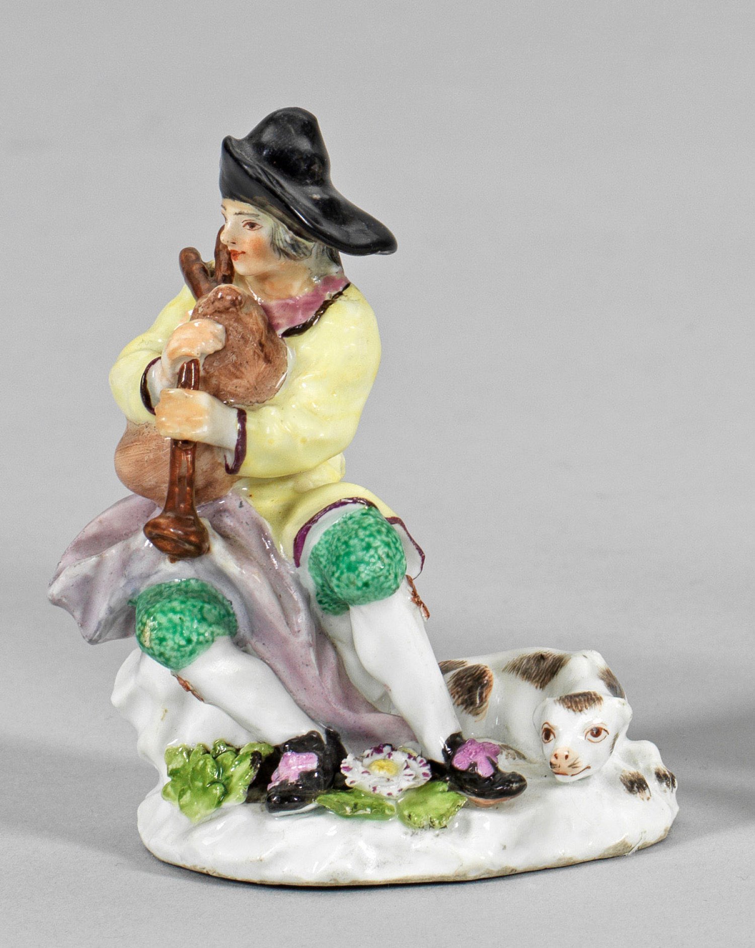 Über ovalem, von plastischen Blüten und Blättern belegtem Natursockel, auf einem Fels sitzender Bauer beim Spielen des Dudelsacks. Zu seiner Rechten liegender Hund. Polychrome Malerei. Entw. J. J. Kaendler. Unw. rest.; Schwertermarke. H. 8,5 cm.