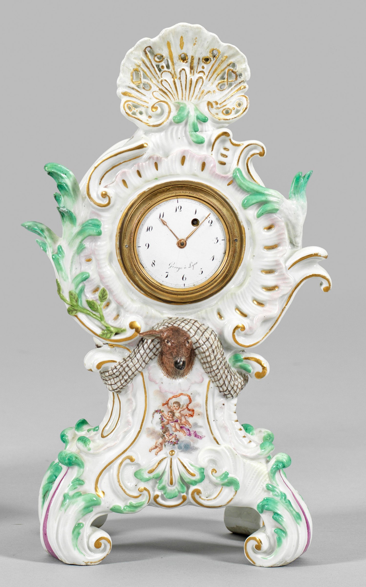 Von vier Volutenfüßen getragener, geschweift aufsteigender, balusterförmiger Korpus mit durchbrochen gearbeiteter Muschelbekrönung. Umlaufend reicher Reliefdekor aus Rocaillen und Blattwerk. Schauseitig ein, von netzartigem Tuchgehänge umzogener, plastischer Rehkopf über der Darstellung von zwischen Wolken schwebenden Boucher-Putten. Auf den Schmalseiten feine Blumengebinde. Polychrome Malerei. Form-Entw. J. J. Kaendler. Messinggerahmtes, herausnehmbares, rundes Taschenuhrwerk mit Schlüsselaufzug. Weißes Emailzifferblatt mit schwarzen arabischen Zahlen, bez. sowie auf Rückplatine sign. "George à Lyon" (um 1807 - 1815 tätig) mit Nr. 3667. Rücks. Gehäusedeckel fehlt. Rest.; Schwertermarke. H. 25 cm.