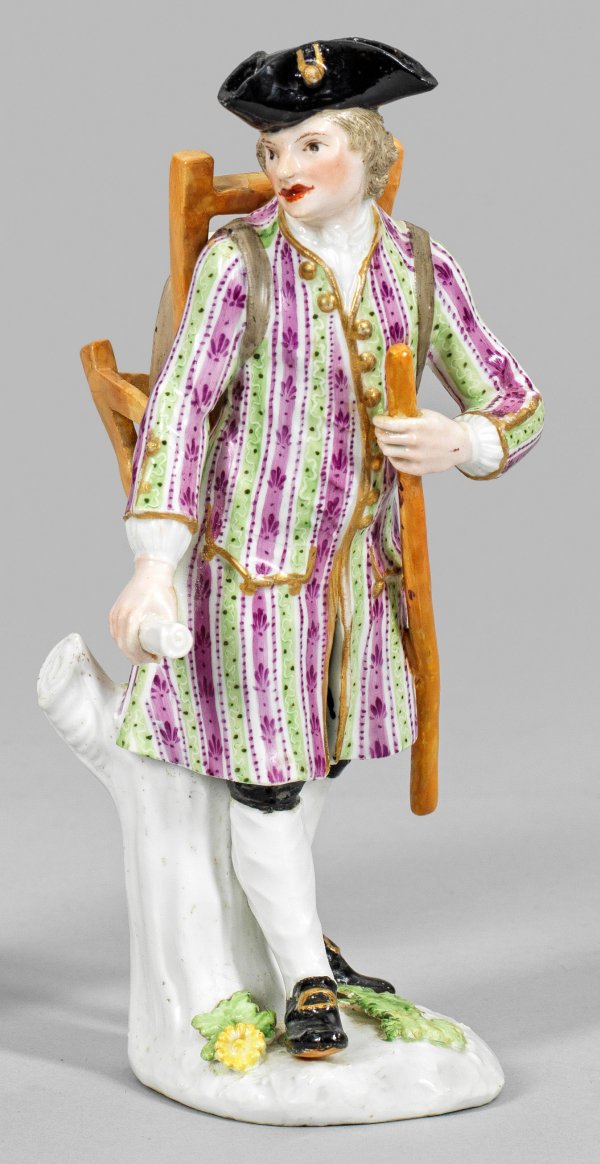 Auf naturalistischem, mit plastischen Blättern und Blüte belegtem Sockel stehender Herr als Pariser Ausrufer in langem, gestreiftem Rock über schwarzer Kniebundhose und schwarzem Dreizack. In den Händen eine Schriftrolle bzw. einen Stock haltend. Auf dem Rücken Holzgestell mit Paket und Schachtel tragend. Polychrome Malerei mit Goldakzentuierungen. Entw. Peter Reinicke und Johann Joachim Kaendler, um 1745. Rest.; Schwertermarke. H. 19 cm.