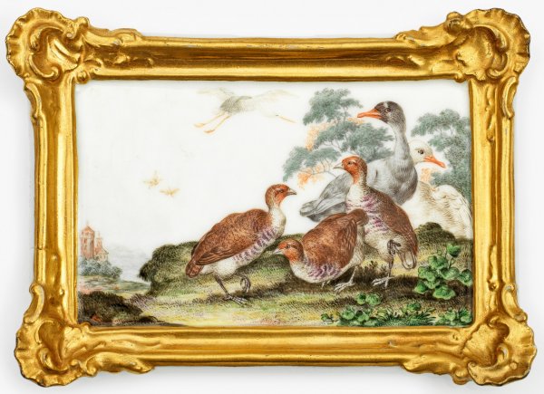 A porcleain plaque (tableau) with finely painted depiction of poultry. Gilt rocaille-moulded frame. Minor chipped/retouched.