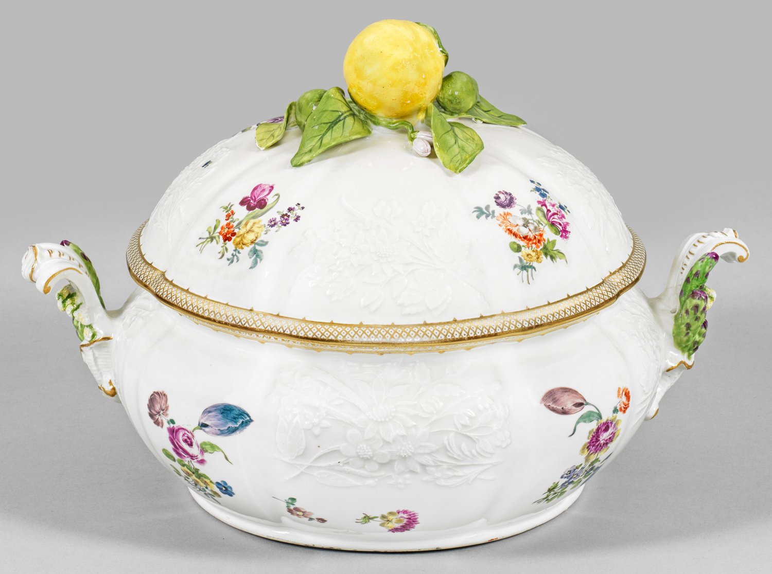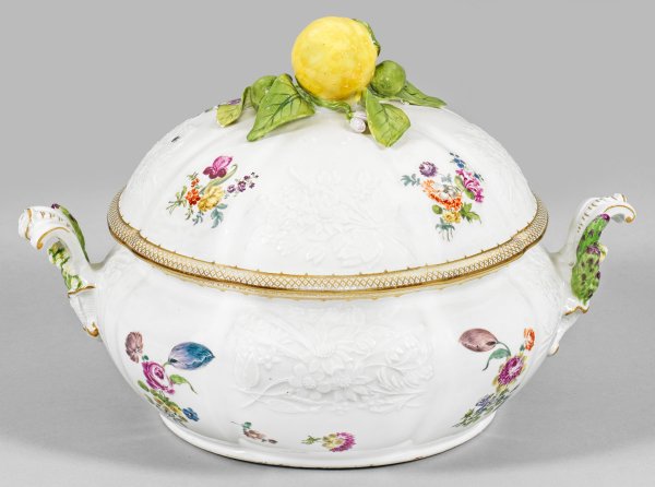 Runder, gebauchter, achtpassig eingezogener Korpus. Volutenförmig hochgezogene, am Ansatz mit plastischem Spargelbündel und Füllhorn gestaltete Griffe. Aufgewölbter Deckel mit großem, vollplastischem Zitronenknauf. Auf der Wandung und dem Deckel sog. "Gotzkowsky"-Relief mit erhabenen Blumen im Wechsel mit farbenfrohen Blumengebinden. Polychrome Malerei, teilw. mit Goldgitterbordüre. Teilw. rest.; Schwertermarke. H. 23,5 cm. D. 30 cm.