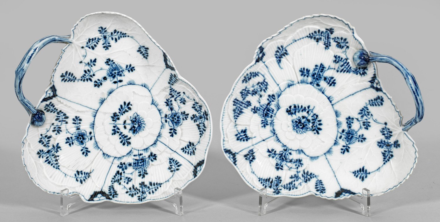 A pair of leaf-shaped dishes with "strawflower" pattern. Blue-painter's mark. Chipped. Crossed swords mark.