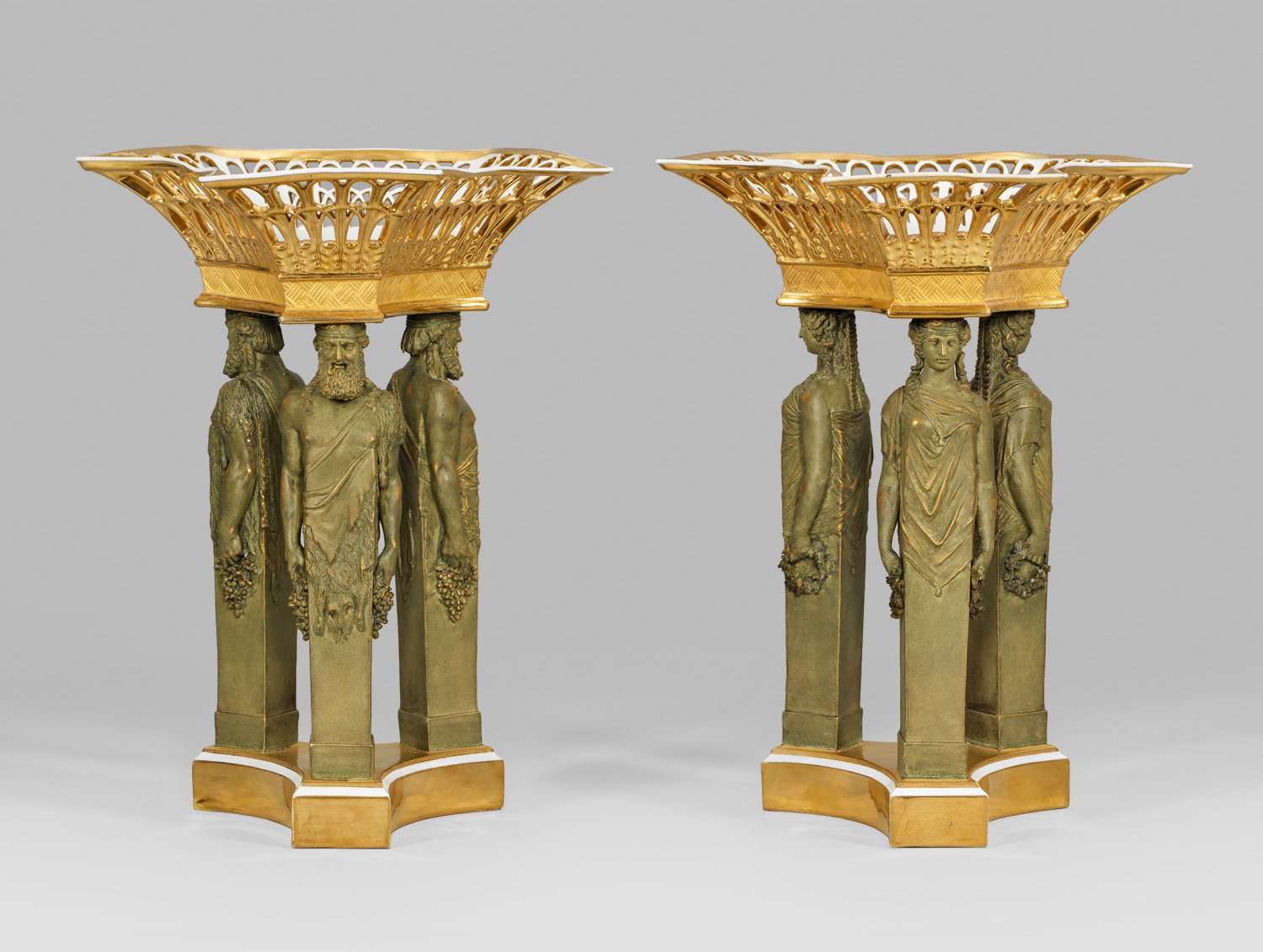 Biskuitporzellan, teilw. glasiert. Über dreipassig eingezogenem Sockel mit abschließender Profilkante, drei männliche bzw. weibliche, vierkantige Karyatiden als Träger für eine korrespondierende Dreipass-Schale. Über profiliertem Ansatz mit schachbrettartigem Flechtmuster-Relief die ausschwingende, bogenförmig durchbrochen gearbeitete Wandung. Auf der Schalenunterseite königsblau bemaltes Fächerrelief mit Rosette. Die Karyatiden in griechisch-antikisierender Weise gestaltet als Flora (Chloris) bzw. Bacchus (Dionysos) mit Blumenkranz und Weinlaub gestaltet, den Frühling und den Herbst symbolisierend. Entw. wohl Johann Carl Friedrich Riese (als Modellmeister tätig 1789 - 1834). Reiche Gold- und grünlich-bronzefarbene Staffage. Im Boden Inv.-Nr.; Zeptermarke. H. 33 cm.