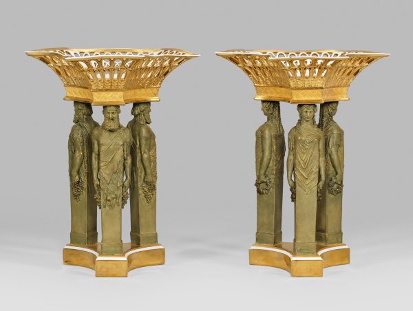 A pair of Empire partly glazed gold- and green-bronzed biscuit porcelain citron baskets with caryatids as table decoration. On the bottom inventory no.; Sceptre mark.