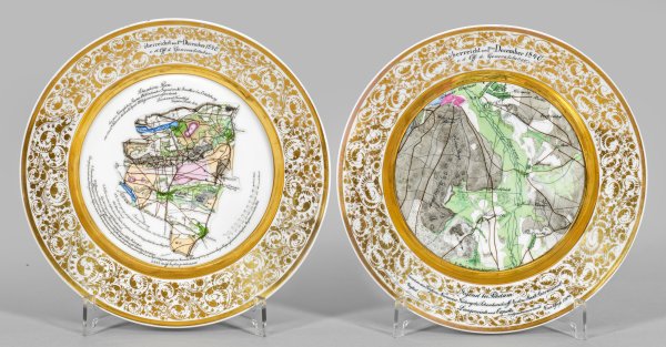 Runde Form. Im vertieften Spiegel farbige, auszughafte Darstellung einer Landkarte der "Gegend bei Potsdam". Zwischen den Dörfern Nowawries, Gütergotz, Schenkendorff und Nudow (...), heutiges Potsdam-Mittelmark bzw. einen "Situations-Plan der zur Königlichen Revue 1802 bestimter Gegend" von Klein Jerutten (poln. Jerutki) bei Ortelsburg in der Woiwodschaft/Masuren (Warminsko-Mazurskie) um 1802 /1809. Nach kartografischen Stichvorlagen von "F. Maull", wohl aus Daniel Gottlob Reymanns "Geographische Specialatlas" bzw. von "Wolff", bez. "Ing.Geogr.delineavit". Polychrome Malerei. Die Fahne mit Rankendekor sowie Inschrift "überreicht am 1ten December 1840 v.d. Off(izier) des Generalstabes". Vergoldeter, konisch ansteigender Steigbord. Zepter- und KPM-Marke. D. 24,5 cm.