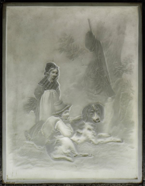 A lead-framed porcelain lithophane depicting two children with dog. Impressed sceptre- and KPM-mark.