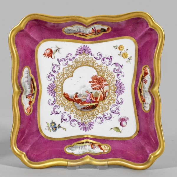 Quadratische, passig geschweifte Form. Im vertieften Spiegel und auf ansteigender Wandung, teilw. in Purpur-Fond ausgesparte, goldkonturierte und -ornamentierte Vierpassreserven mit sog. Kauffahrteiszenen in der Manier des 18. Jhs.; Polychrome Malerei mit reicher Goldstaffage. Minim. rest.; Schwertermarke. 21 cm x 21 cm.