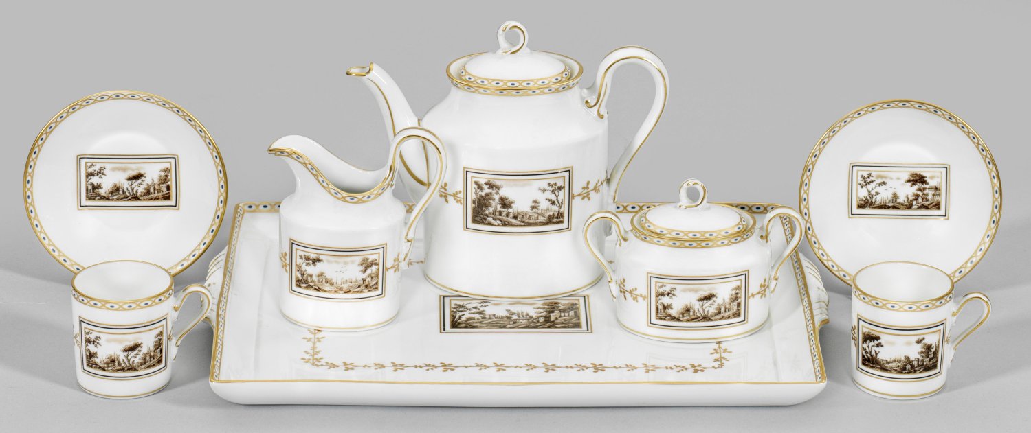 6-tlg.; Mokkakanne, Zuckerdose, Sahnegießer, 2 Mokkatassen mit Untertassen, Tablett. Empirestil mit goldgerahmten Architektur-Landschaften in Grisaillemalerei. Reiche Goldstaffage. Kannen-H. 15,5 cm.