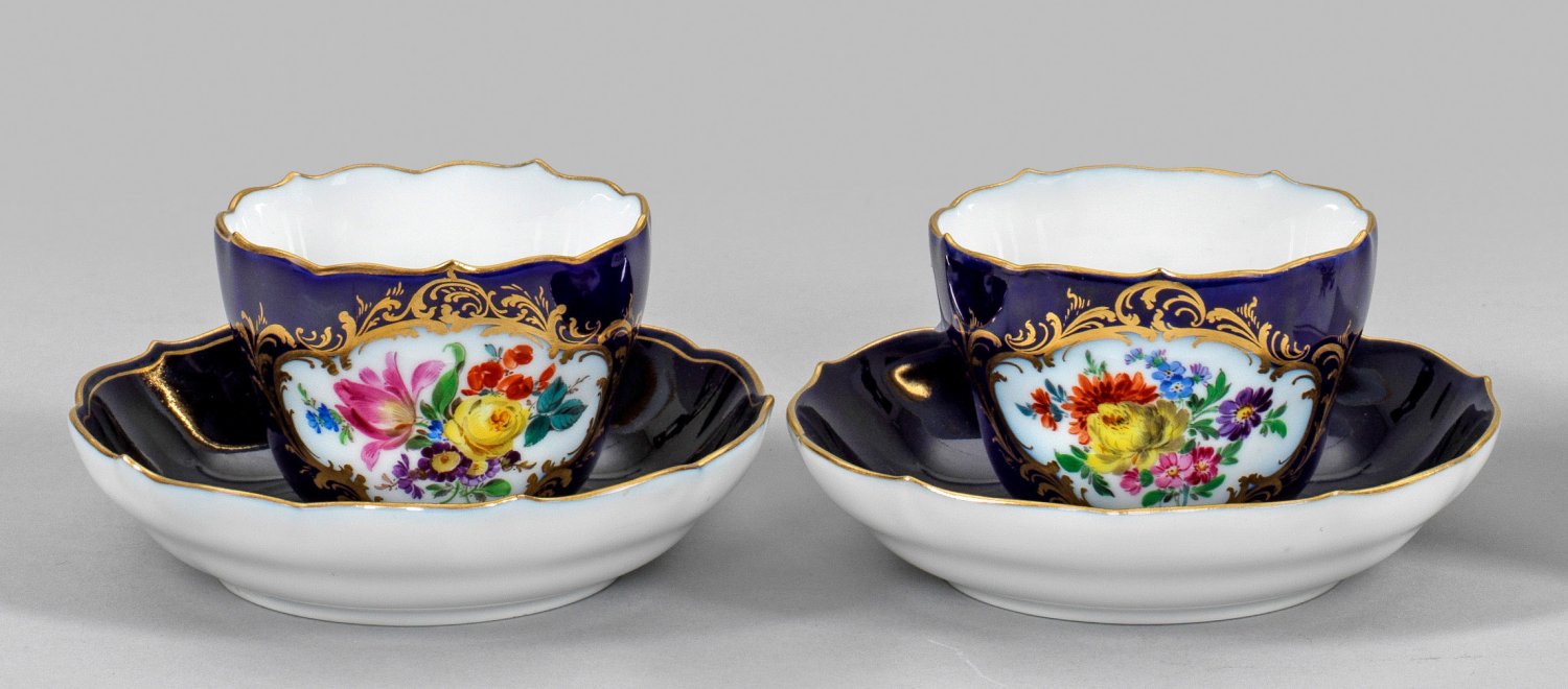 A pair of cobalt-blue porcelain mocha cups and saucers with flower decor. Crossed swords mark.