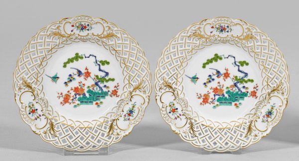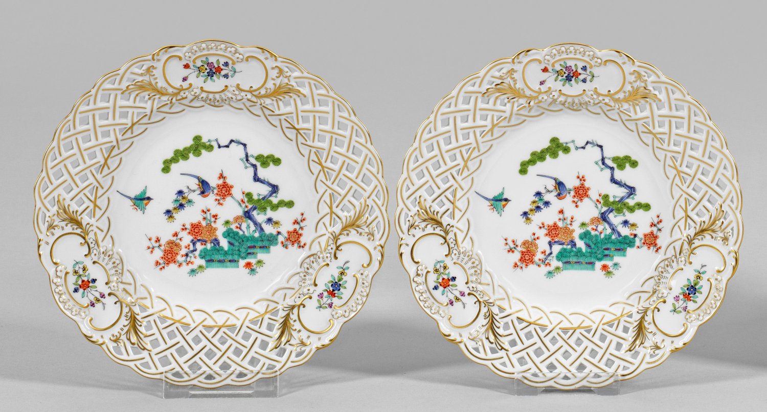 Rand durchbrochen gearbeitet. Feiner Dekor nach ostasiatischen Vorbildern, sog. "Drei Freunde" mit Prunus, Bambus und Pinie (bzw. "Indisches Astmuster"). Polychrome Malerei im Kakiemonstil mit Goldstaffage. Schwertermarke und Jahreszeichen. Teller-D. 18,5 cm.