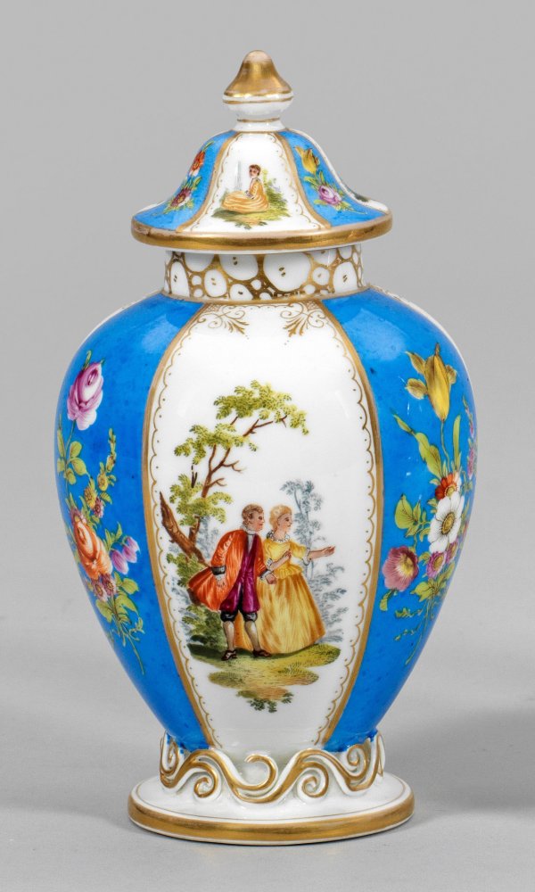 Geringfügig eingezogene Balusterform mit gewölbtem Deckel. Unterhalb plastische Wellenbordüre. Umlaufend sechs goldgerahmte Reserven mit galanten Szenen im Wechsel mit Blumenbuketts auf blauem Fond. Polychrome Malerei. Golddekor. Zeptermarke. H. 17,5 cm.