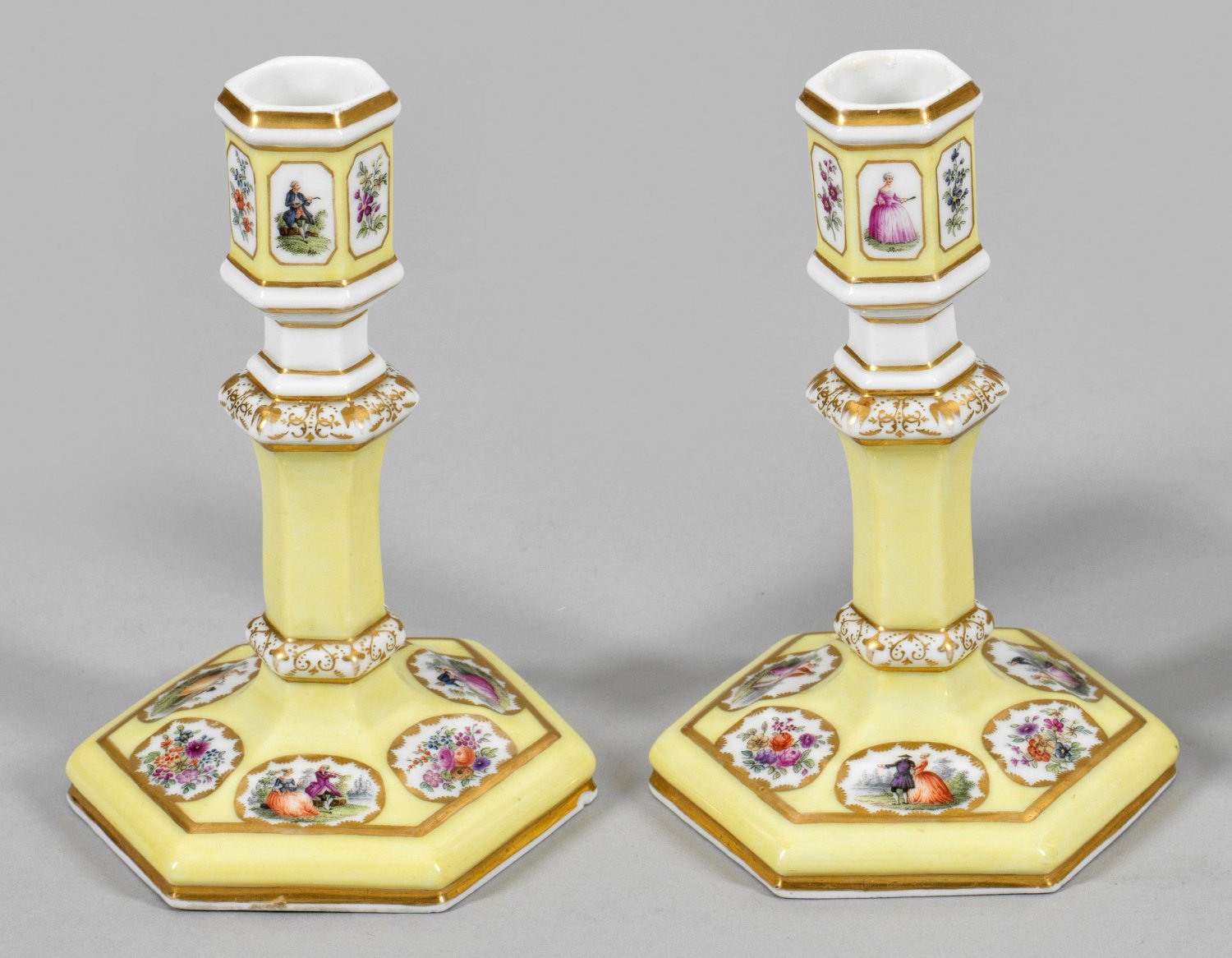 Lot 2535: Paar Kerzenhalter mit Watteau- und Blumendekor