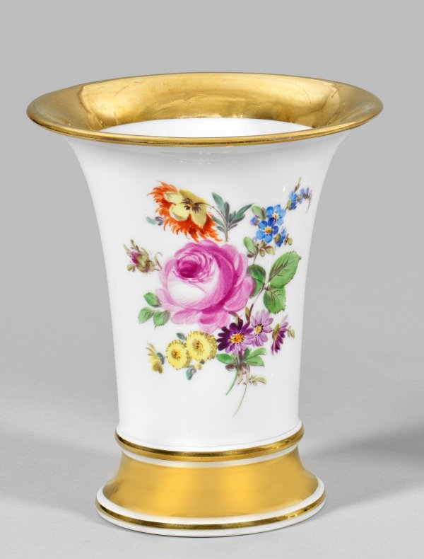 A porcelain vase with flower decor and gold. Crossed swords mark.