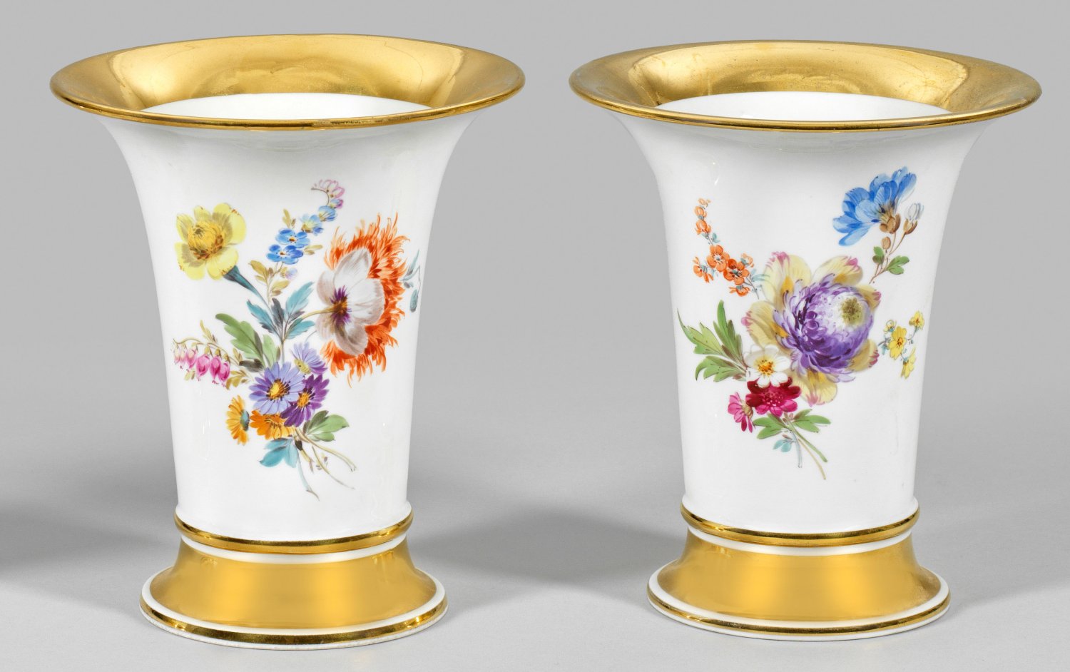 Two porcelain vases with flower decor and gold, partly minor rubbed. Crossed swords mark.