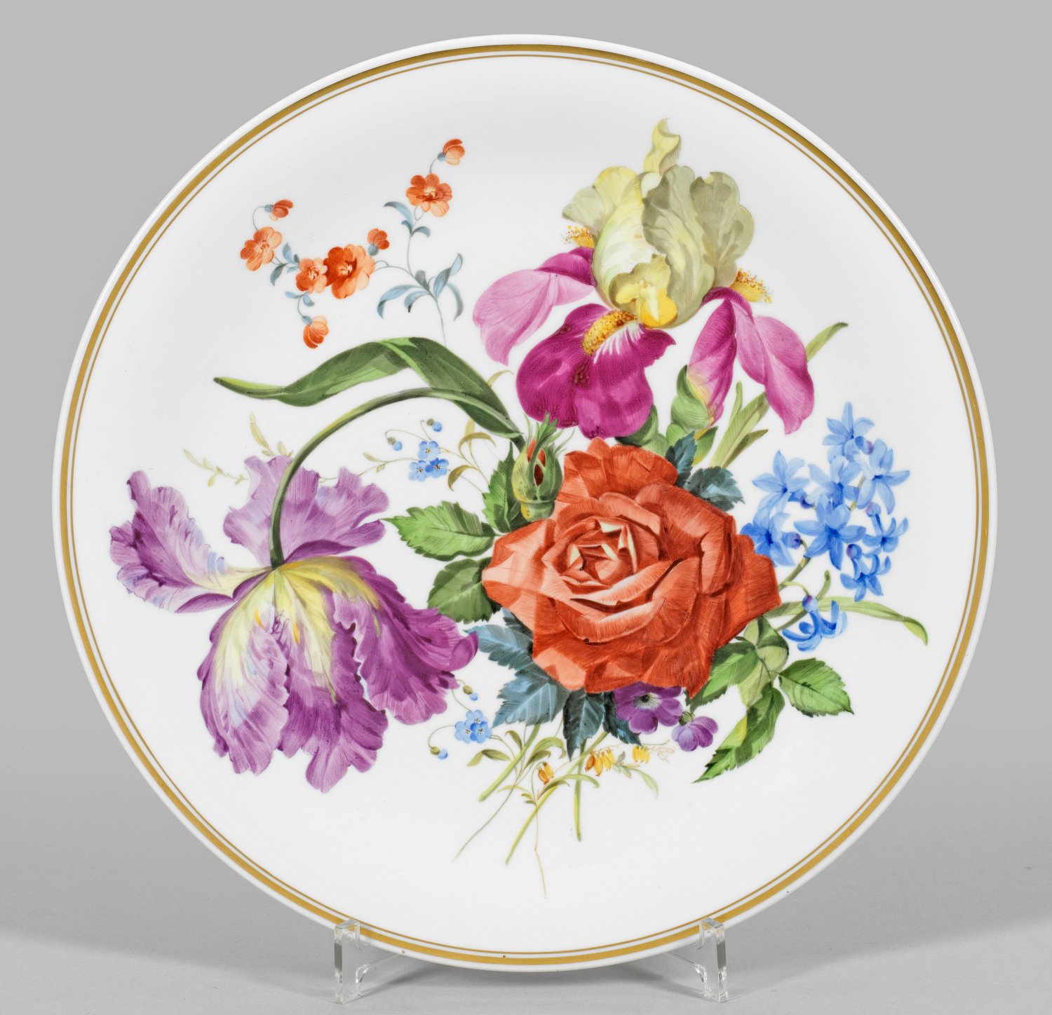 Runde Form mit glattem Rand. Im flach gemuldeten Spiegel großflächig angelegtes, farbenprächtiges Arrangement aus Rosen, Tulpen, Hyazinthen und Schwertlilien in polychromer Malerei. Goldrand. Im Boden Maler-Sign. mit Dat. "Bärbel Patzig 1999". Gold-Nr. "220414 203". Rücks. Wandaufhängung. Schwertermarke. D. 36 cm.
