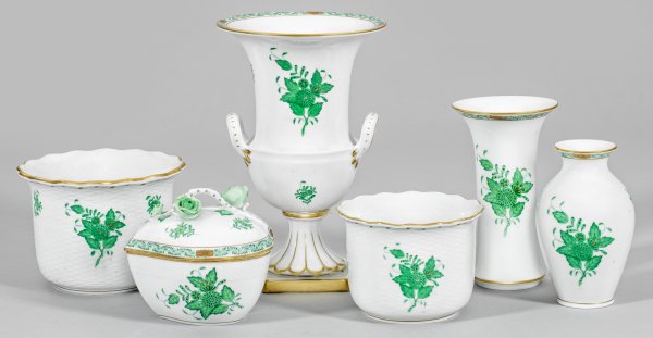 6-tlg.; 3 Vasen, 2 Cachepots, Dose in Herzform. Dekor "Apponyi grün" teilw. mit Ozierrelief. Goldstaffage. Dose unw. best.; Manufakturmarke. Vasen-H. 13 cm - 24 cm.