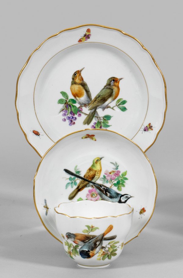 3-tlg.; Kaffeetasse mit Untertasse, Dessertteller. Naturalistische, polychrome Vogelmalerei mit Insekten. Goldrand. Schwertermarke. Tassen-H. 6 cm. Teller-D. 17,5 cm.