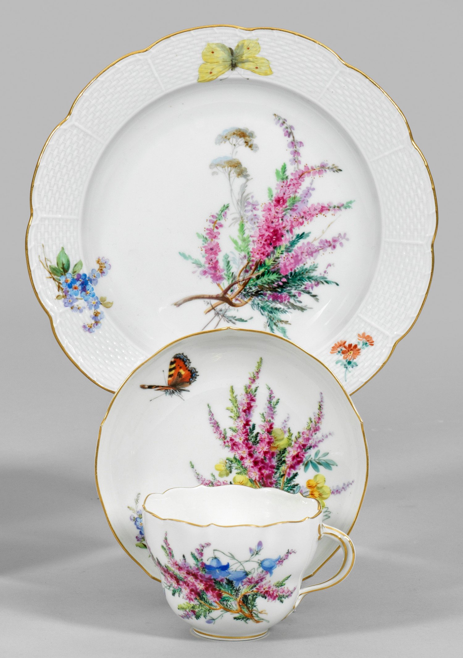 3-tlg.; Kaffeetasse mit Untertassen, Kuchenteller. Tamariskensträuße, Blütenzweige und Schmetterlinge in polychromer Malerei. Goldrand. Schwertermarke, teilw. mit Jubiläumsmarke 1710 - 1910. Tassen-H. 6 cm. Teller-D. 21 cm.