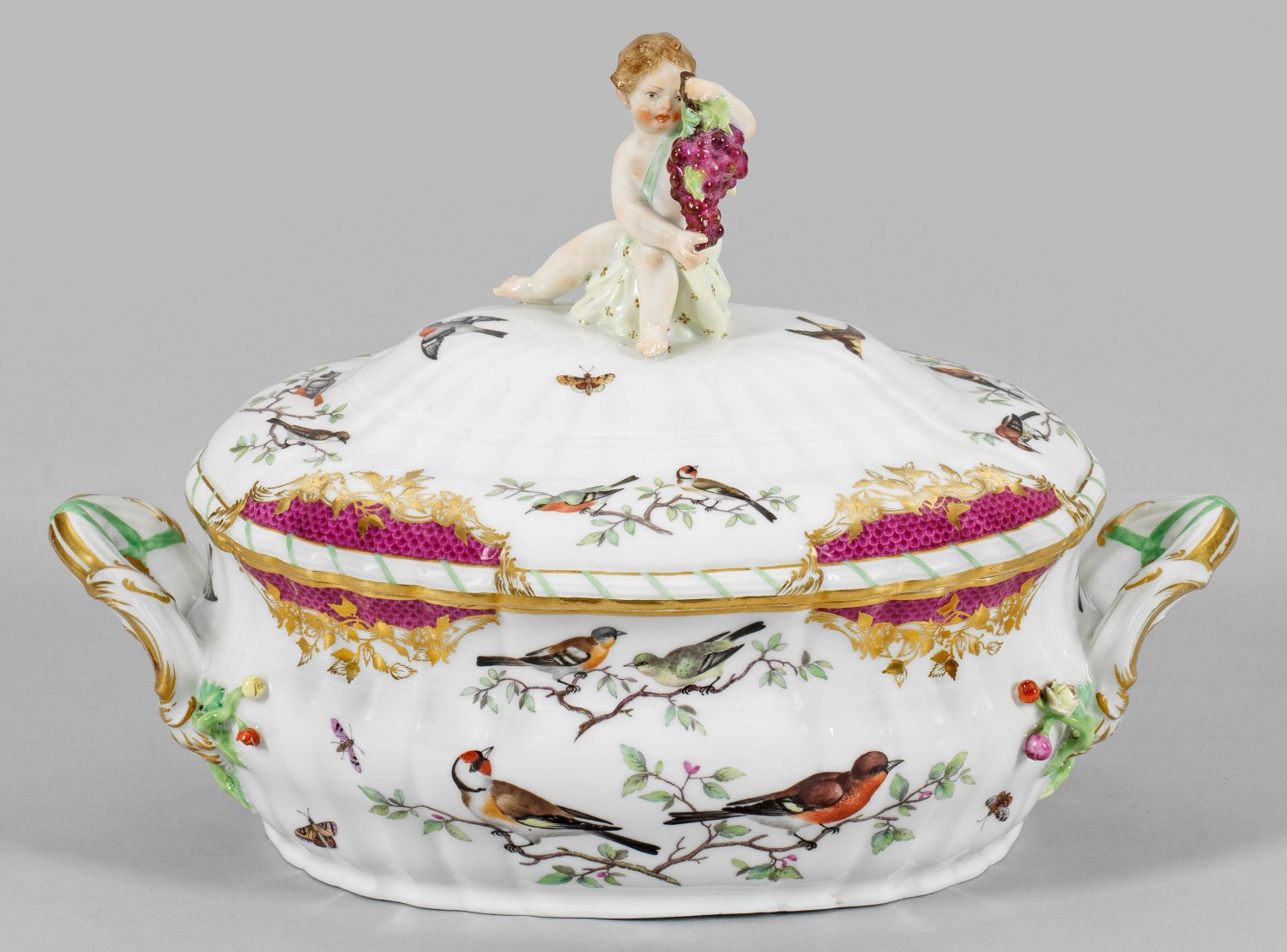 Form "Antikzierrat". Ovaler, gebauchter Korpus. Seitliche Asthenkel sowie gehöhter Deckel, mittig Putto mit Traubenbündel als Knauf. Prächtiger Dekor aus heimischen, auf Ast sitzenden Vögeln sowie Schmetterlingen und Insekten in polychromer Malerei. Der Rand mit purpurfarbenen, von Goldranken gerahmten Schuppenmosaikfonds. Zeptermarke. H. 21 cm. L. 28 cm.