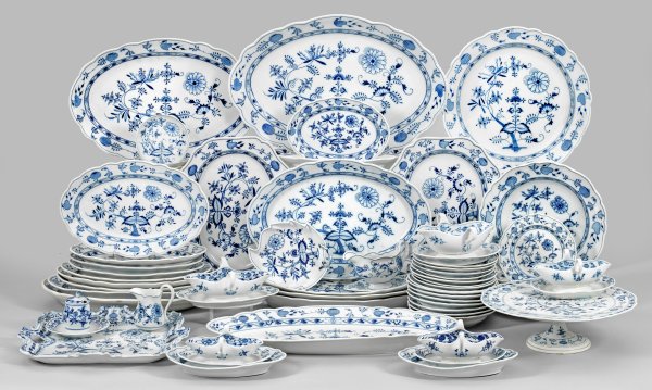 57-tlg.; Senftopf, Sahnegießer, 3 Untertassen, Blattschale, 6 Anbiet-, 7 Suppen-, 8 Kuchenteller, Kuchen-, 3 Anbiet-, 18 Braten-, Fischplatte, 6 Saucieren, Tablett. Teilw. minim. besch. und rest.; Unterglasurblauer Zwiebelmusterdekor. Schwertermarke und Manufakturmarken. Beigabe: 2 Gemüse- bzw. Obstschalen, Italien. Dessertteller rest.