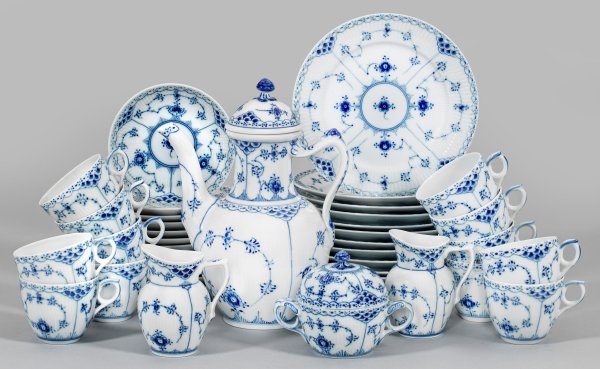für acht Personen. 28-tlg.; Kaffeekanne, 2 Milchkännchen, Zuckerdose, 8 Kaffeetassen mit 12 Untertassen, 12 Dessertteller. Reliefdekor "Gebrochener Stab" mit "Musselmalet Halbspitze"-Dekor in unterglasurblauer Malerei. Beigabe: 2 Suppentassen. Manufakturmarke. Teller-D. 13,5 cm - 19,5 cm, Kannen-H. 24 cm.