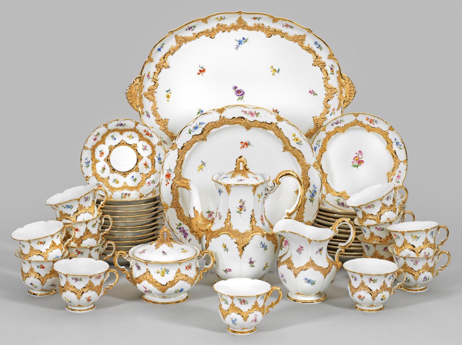 für zwölf Personen. 30-tlg.; Kaffeekanne, Sahnegießer, Zuckerdose, 13 Kaffeetassen mit Untertassen, 12 Kuchenteller, Anbietschale, Tablett. Rocaillen in Glanzgold bzw. Goldbronze sowie mit feinen Streublumen in polychromer Malerei auf weißem Fond. Sog. "B-Form". Teilw. minim. best., Henkel einer Tasse rest.; Schwertermarke. Kannen-H. 26 cm, Tablett-L. 45 cm.