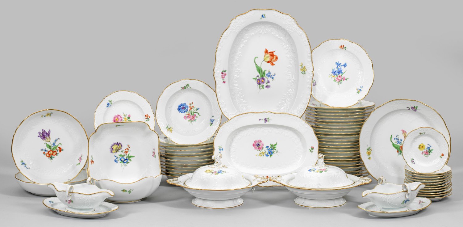 für 12 Personen. 71-tlg.; 12 Vorspeisen-, 12 Speise-, 12 Suppen-, 12 Brot-, 12 Kuchen-, Anbietteller, 2 Deckelterrinen, 2 Bratenplatten, 4 Anbietschalen, 2 Saucieren. Reliefdekor "Marseille". Auf der Wandung in den Schildern Streublumen. Schwertermarke. Goldzahnkante. Teller-D. 31 cm, Platten-L. 36 cm - 44 cm.